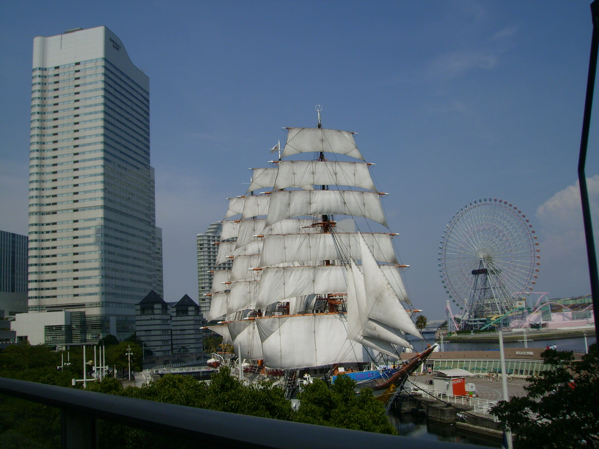桜木町から直ぐランドマークタワーのエレベータ 利用上がり着ると総帆展帆した白く綺麗な日本丸がみえます。 全部で29枚の白い帆をボランティヤの皆様の協力があり 美しく総帆展した日本丸の姿を見る事が出来ます。 総帆展帆実施予定は 日本丸メモリアルパークへ